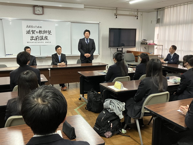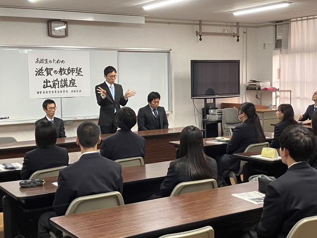 11月11日(火)に滋賀県教育委員会事務局教職員課主催の『滋賀の教師塾』出前講座が本校で開催されました。 講師として、本校卒業生で現在小学校、高等学校、養護学校に勤務されている現役教諭3名をお招きしました。将来教師・保育士・幼稚園教諭を目指す本校生徒 10名が参加し、『滋賀の教師塾』で教職を志している大学生3名とともに、貴重なお話を伺いました。 生徒も最初は緊張した面持ちで話を聞いていましたが、講師の先生方の教師としての熱意や優しさに触れると次第に気持ちが和らぎ、時間いっぱいまで多くの質問が飛び交い、充実した時間となりました。 生徒たちからは「普段聞けないことを聞く良い機会になった」「人との関わりが大切で生徒たちの成長が見られるのは楽しそうだと思った」「やりがいを感じながらお仕事をされていることがわかった」などの感想が聞かれました。教師という仕事に対しての興味・関心が高まり、自分も教師になりたいという気持ちを一層強くしたひと時となりました。