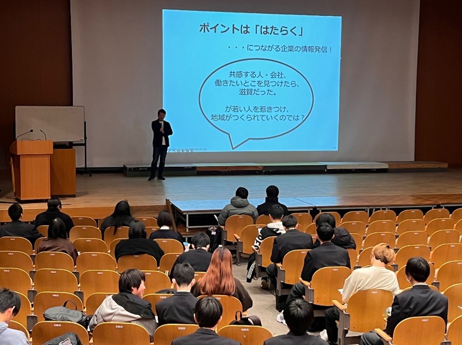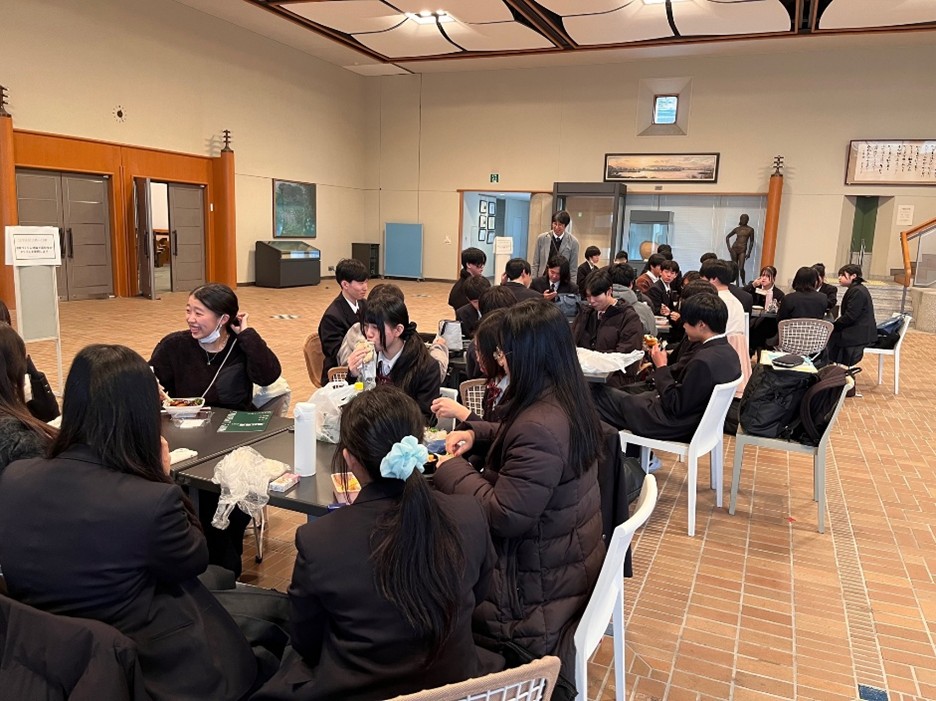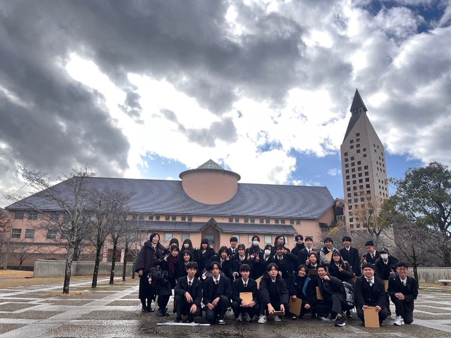 12/15(月)、「しがアントレプレナーシップハイスクール(SESH)事業」の一環として、滋賀県立大学にご協力を賜り、大学見学・授業体験ツアーを実施し、1年生29名が参加しました。 まず、実際に滋賀県立大学生が受講している授業「地域づくり人材論」に参加し、ゲスト講師のお話を伺いました。講義の内容はもちろん、ホールでの90分の講義という大学ならではの授業に大きな刺激を受けました。 授業後は、滋賀県立大学の学生の皆さんと昼食をとりながら交流し、大学の選び方、大学での学び、実際の学生生活などの質問に答えていただきました。 オープンキャンパスとは違う普段の大学の様子を見る貴重な機会となり、「大学の授業や大学生のイメージがわいた」「いろいろな大学を見比べたくなった」という感想が聞かれました。