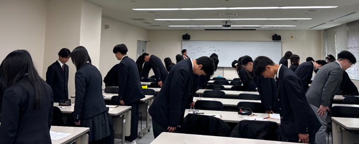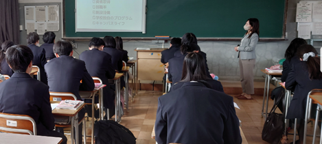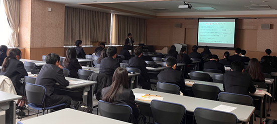 12/16(月)、「しがアントレプレナーシップハイスクール(SESH)事業」の一環として、滋賀県立大学にご協力を賜り、大学見学・授業体験ツアーを実施し、1年生・2年生計29名が参加しました。 まず、実際に滋賀県立大学生が受講している授業「地域づくり人材論」に参加しゲスト講師のお話を伺いました。講義の内容はもちろん、90分の階段教室での講義という大学ならではの授業に刺激を受けました。 授業後は、滋賀県立大学の学生の皆さんと昼食をとりながら交流し、大学の選び方、大学での学び、実際の学生生活などの質問に答えていただきました。 オープンキャンパスでは体験できないような、普段の大学を見る貴重な機会となり、「参加してよかった」「いろいろな大学を見比べたくなった」「大学の授業や大学生のイメージがわいた」という感想が聞かれました。