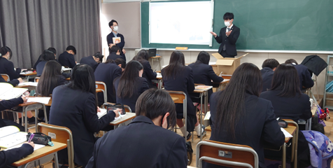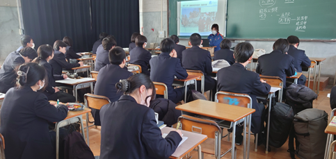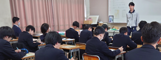 3月11日(月)3時間目、2年生対象進路統一LHRを実施しました。当日は、今春から四年制大学や短期大学に進学する卒業生、企業に就職する卒業生、公務員として勤務する卒業生に来校してもらいました。卒業生たちには、2年生のうちから頑張ったこと、3年生で取り組んだこと、やって良かったこと、やっておいた方が良かったこと、部活動と勉強の両立、成功談や失敗談などを、それぞれの視点から話してもらいました。 2年生からは、「受験に対して色々不安だったが、先輩たちも不安だったと聞いて、少し安心した。基礎固めが大切だと、どの先輩たちも話していたので、基礎をしっかり固めたい。」「検定試験の大切さを知った。挑戦したい。」「成績を上げる、遅刻欠席をしないなど日々の生活が大事だということを改めて感じた。」という声がありました。進路実現に向けてどのように過ごすかを考える良い機会となりました。