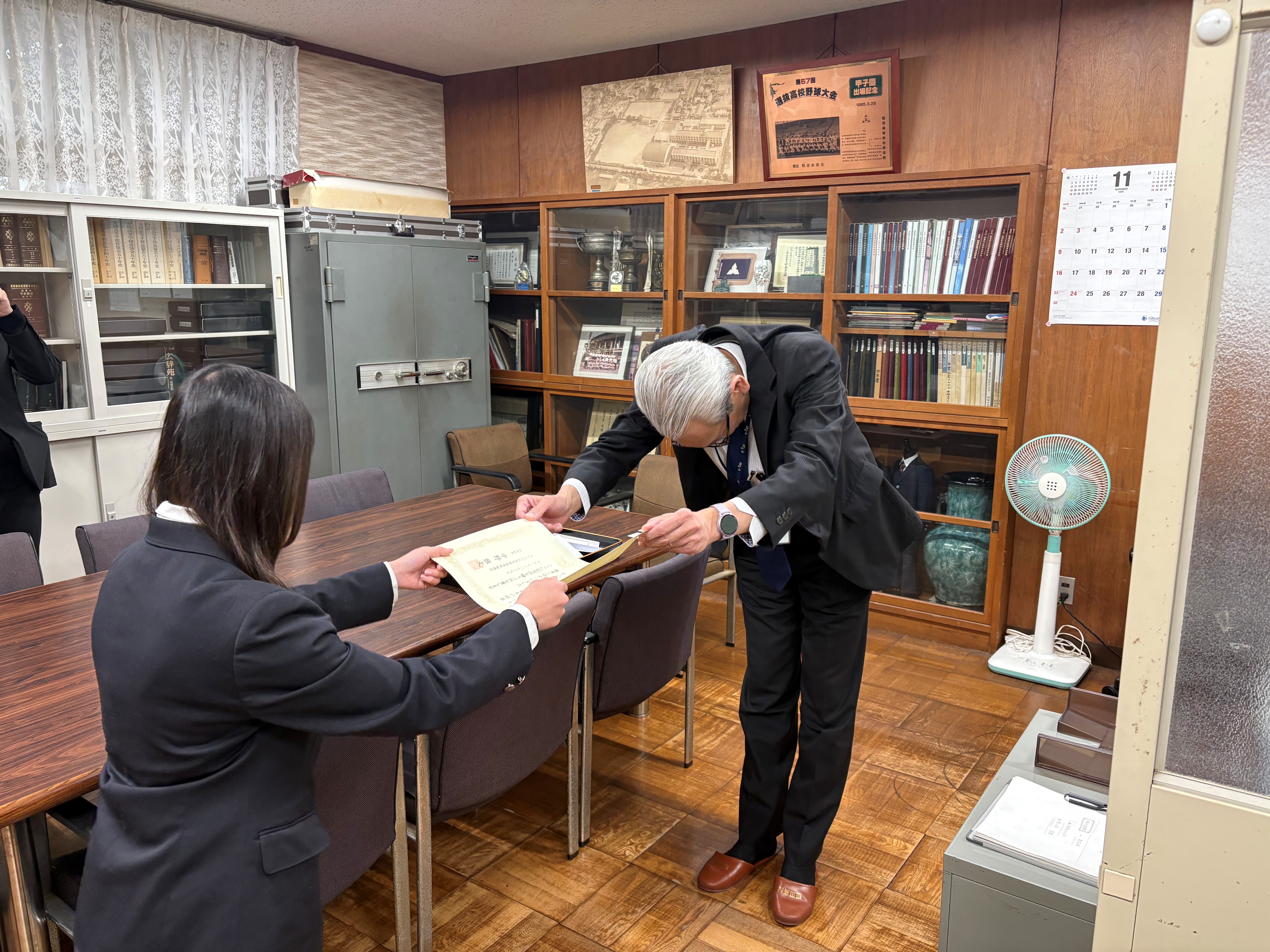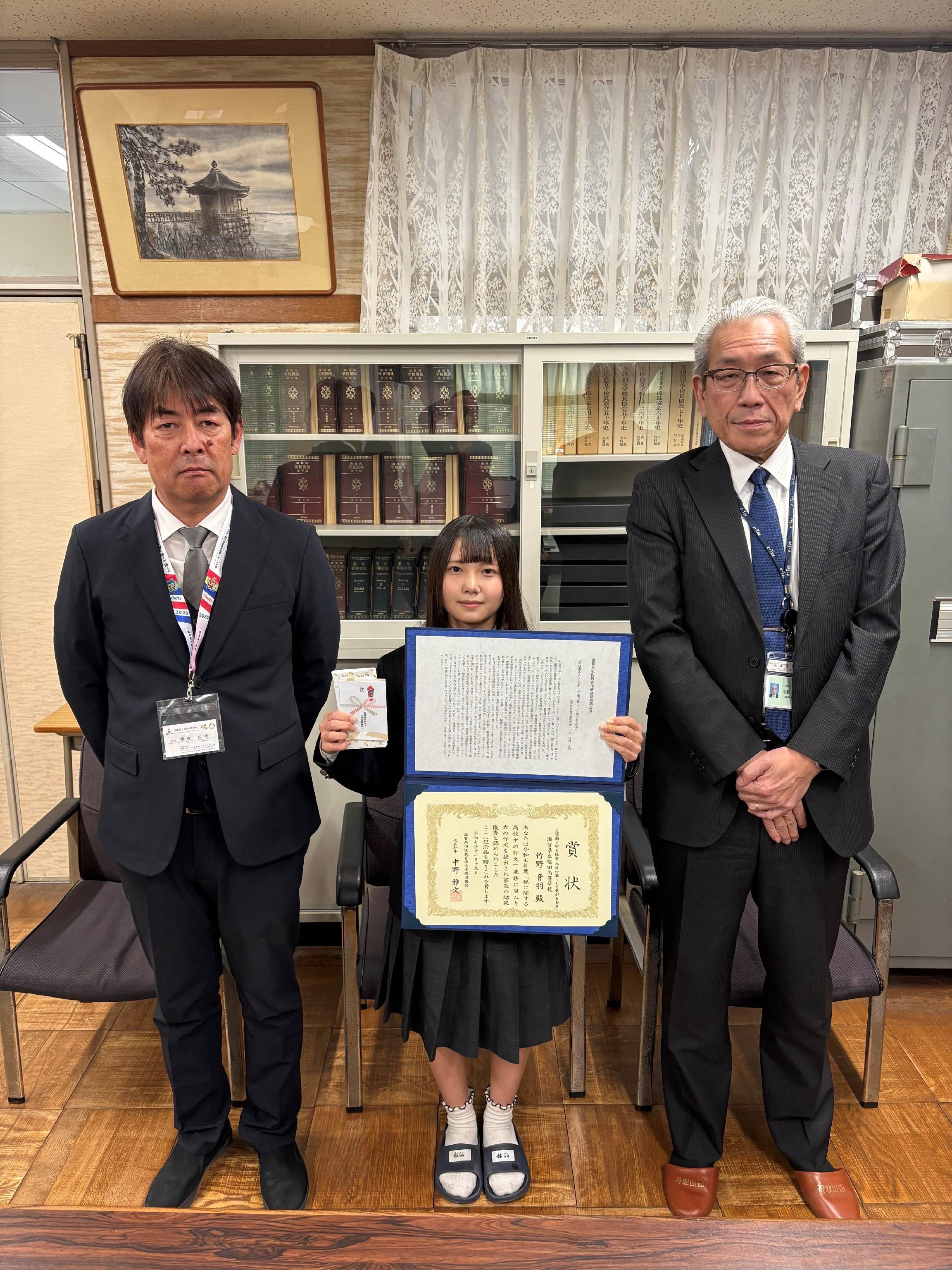 12月17日(水)本校の校長室にて、「税に関する高校生の作文」表彰が実施されました。本校第1学年238名が夏季休業期間中に作文に取り組んだ中から、1年4組竹野音羽さんが「滋賀県租税教育推進連絡協議会賞」を受賞しました。大津税務署より賞状と記念品の贈呈がありました。竹野さんおめでとうございます。