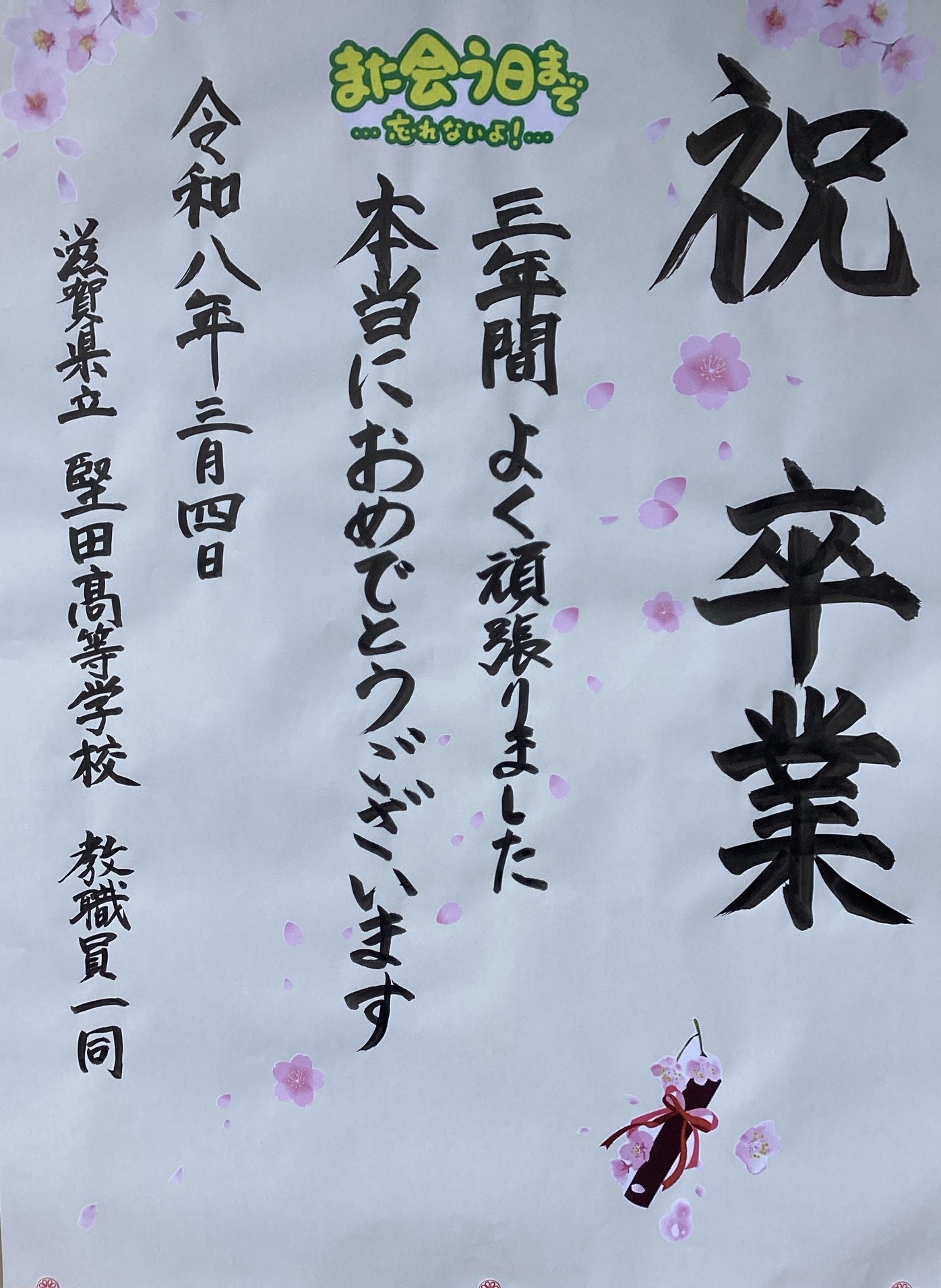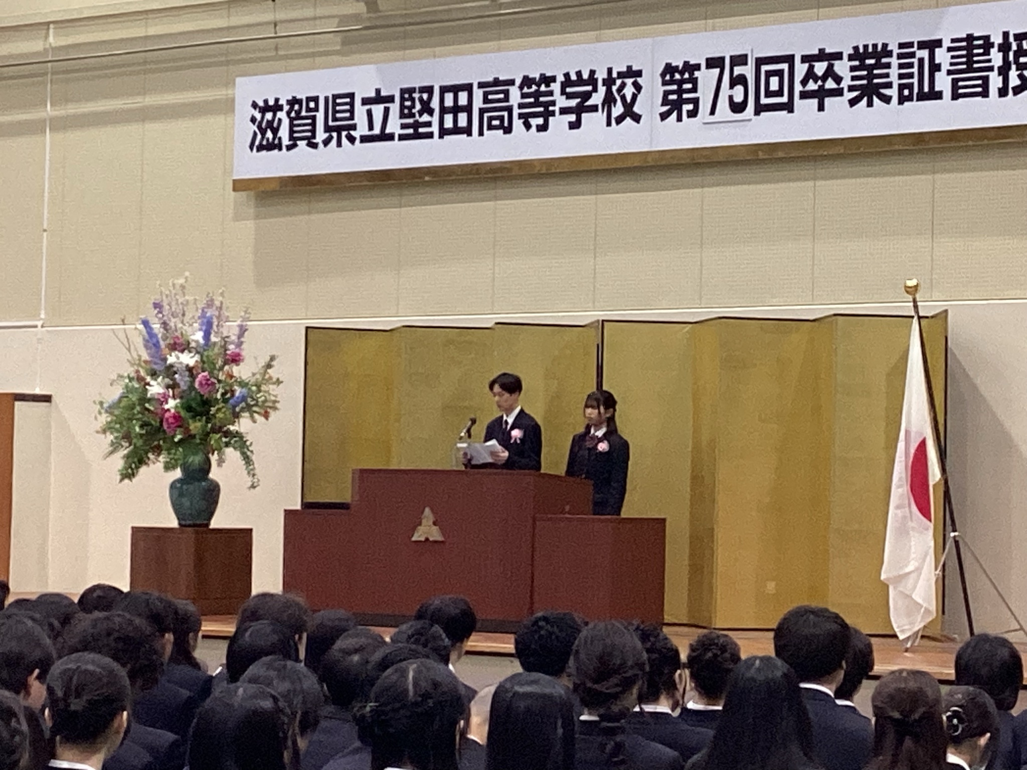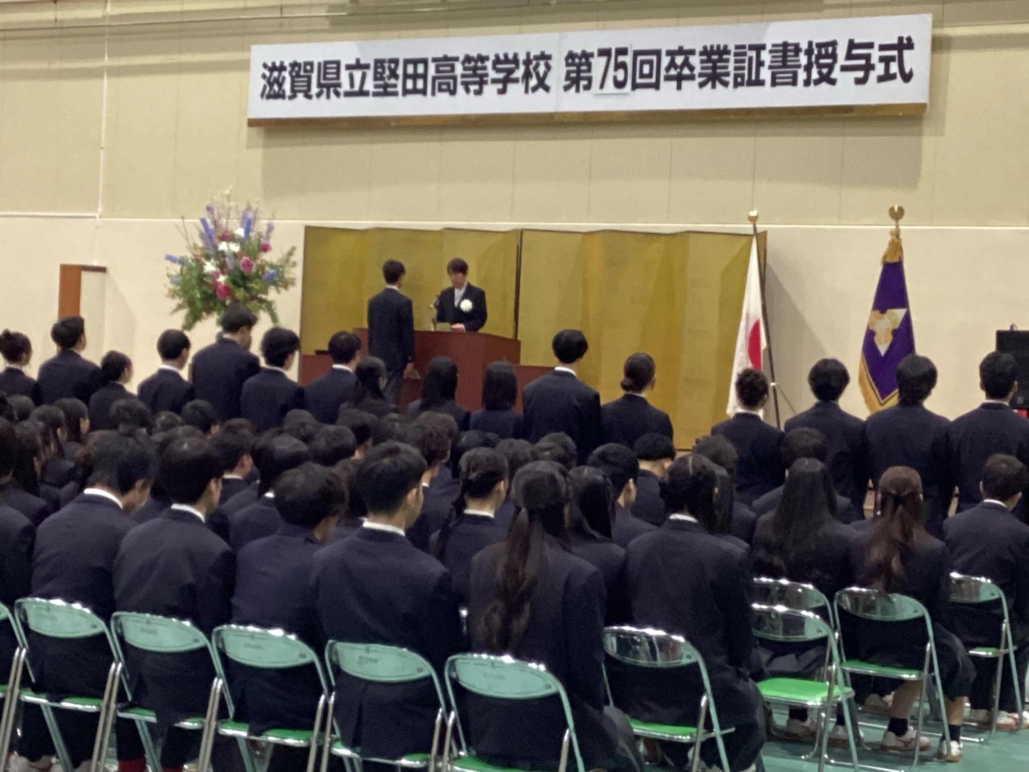 3月4日(水)に、ご来賓として10名の方々にご臨席いただき、厳粛なる雰囲気の中、第75回卒業証書授与式が挙行されました。饗庭校長の式辞では、それぞれの進路を歩み始める卒業生にむけて「自分らしさを発揮できる場所は最初から用意されているのではなく、置かれた場所で、立場や責任を自覚して向き合うことで自分でも気づいていなかった力が引き出されていく。」「堅田高校の卒業生として校訓である`和と礼譲`の精神を忘れず、人を愛し、人に愛され、心豊かな人生を送ってください。」などの言葉をいただきました。卒業生の皆さん、ご卒業おめでとうございます。卒業生212名の皆さんの今後の活躍を祈っております。